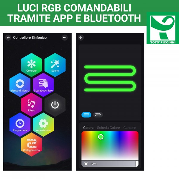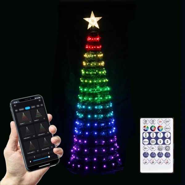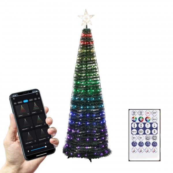 Questo albero non è solo pratico, è anche uno spettacolo di luci e tecnologia! Dotato di illuminazione LUCE RGB, offre una gamma infinita di colori brillanti. Il controllo è completo e intuitivo: potrai utilizzare il TELECOMANDO incluso per scegliere facilmente tra un'ampia selezione di GIOCHI DI COLORE preimpostati. In aggiunta, questo modello offre la possibilità di controllare l'albero direttamente tramite APPLICAZIONE sul tuo smartphone, permettendoti di personalizzare, programmare e gestire le luci con la massima comodità, creando ogni giorno un'atmosfera diversa, dal classico al più dinamico e moderno.