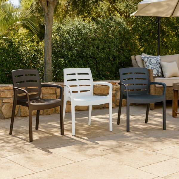 La sedia BORNEO non è solo bella, ma anche incredibilmente comoda. La seduta ergonomica e lo schienale ben studiato offrono un comfort ottimale, perfetto per rilassarsi in giardino, sul terrazzo o per accogliere i tuoi ospiti in un locale. E quando non la usi, puoi impilarla facilmente, risparmiando spazio prezioso.