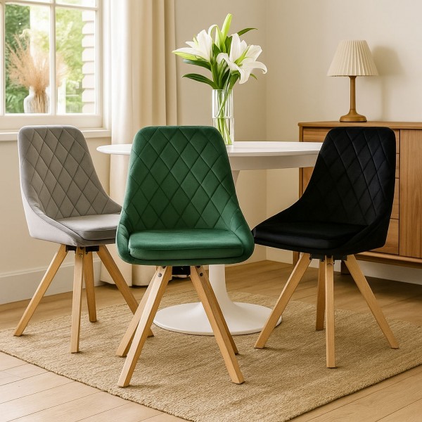 La seduta e lo schienale sono interamente imbottiti in gommapiuma di alta qualità, offrendo un comfort ottimale per lunghe sessioni. Il rivestimento in velluto aggiunge un tocco di raffinatezza e morbidezza al tatto. La struttura è realizzata in legno robusto, con gambe in legno di faggio che garantiscono stabilità e durata nel tempo.